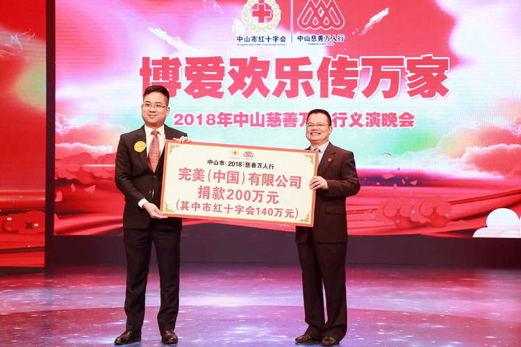 1月26日,“博爱欢乐传万家——中山市2018年(第31届)慈善万人行义演晚会”在中山市广播电视台举行。完美公司现场捐赠善款200万元,是本届活动捐款金额最大的企业。这是完美连续第23年向中山市慈善万人行活动捐款,累计捐赠总额逾2900万元,为中山慈善事业付出不懈努力。