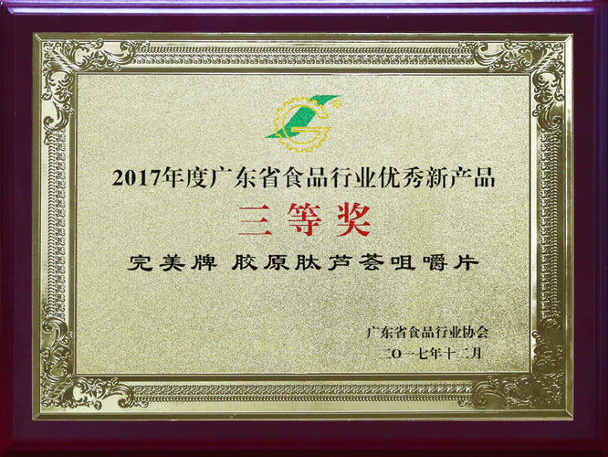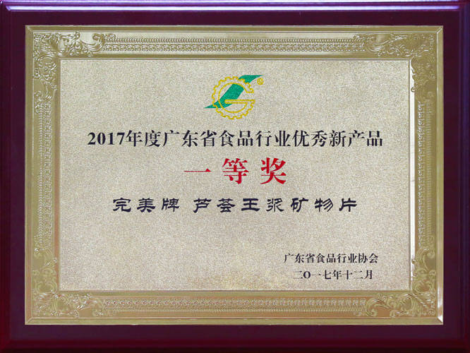 经过专家对产品的创新性、市场前景等方面进行综合评价,评选结果于近日揭晓。完美牌芦荟王浆矿物片、完美牌语泰片、完美牌胶原肽芦荟咀嚼片三款产品脱颖而出,被认定为“2017年度广东省食品行业优秀新产品”,并分获一、二、三等奖。获认定的优秀产品可编入《广东省食品行业消费品供给指南》,面向全省乃至全国发行宣传。