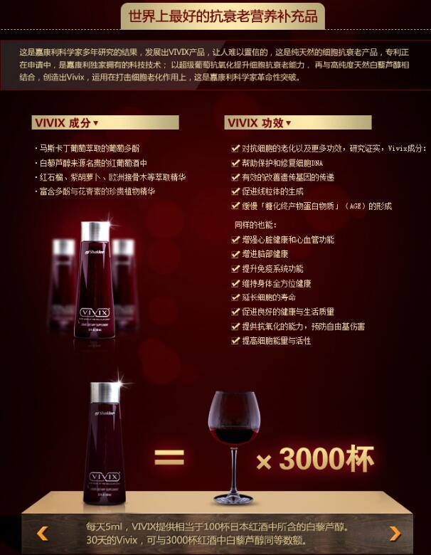 喝红酒可以延缓衰老,喝一瓶VIVIX相当于3000杯葡萄酒,这是嘉康利旗下明星产品VIVIX的产品介绍。记者搜索到嘉康利(中国)在线商城,其还声称VIVIX是 “美白抗氧化,延缓衰老,全方位保健,提高免疫,独一无二的抗衰老产品”。