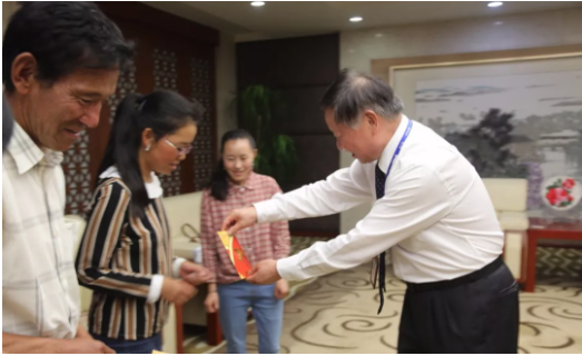 ▲徐董亲手为次仁曲吉、次仁拉姆送慰问金
