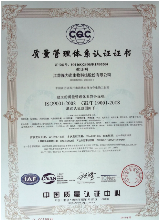 2017年,隆力奇先后通过了国家工信部两化融合管理体系审核并获得两化融合管理体系评定,以及CNAS国家实验室认证,标志着隆力奇实验室具备了检测和校准的技术能力。同时,隆力奇先后全面通过了ISO9001质量管理体系和ISO14001环境管理体系的全面认证,按照10万级GMP的标准规范运行,确保产品与服务质量。