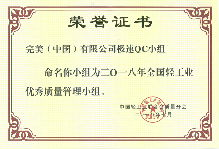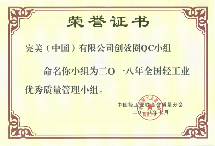 全国轻工业优秀质量管理小组最佳成果奖花落完美