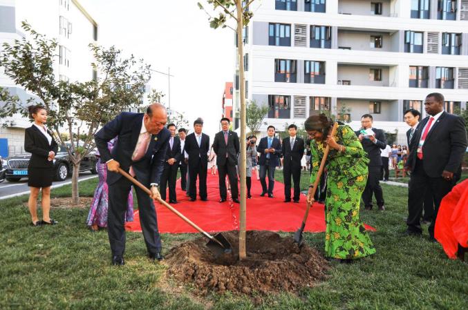 会谈结束后,李金元陪同孔戴夫人一行参观了天狮学院。随后,在天狮学院校区内举行了“友谊与和平”纪念碑揭幕仪式,李金元与孔戴夫人共同栽种了一株象征“友谊与和平”的法桐树。孔戴夫人表示,看到天狮学院的校园风貌及规划图景令人激动,希望未来有机会在教育领域与几内亚国内大学展开合作。