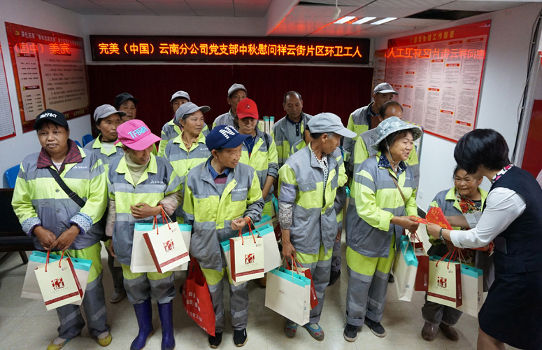 9月19日,在中秋节来临之际,云南分公司党支部为昆明市祥云街片区20余名环卫工人送去爱心月饼、节日慰问品以及慰问金,感谢他们用勤劳的双手,带给城市清洁和美丽。