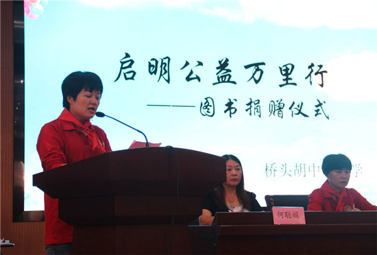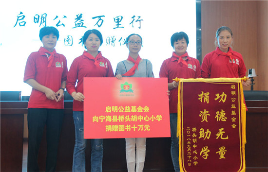 “启明公益万里行——阅读点亮人生”捐书助学活动,是启明公益基金会学习贯彻十九大精神,助力中国教育事业的真实实践。9月28日,该活动走进浙江省宁波市宁海县,在宁海县桥头胡中心小学举行了“启明公益万里行——浙江宁海站”图书捐赠仪式,启明公益基金会捐赠了价值10万元的图书,为创建“书香校园”贡献了绵薄之力,“中国航天启明图书室”在桥头胡中心小学揭牌落成。