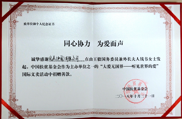 完美公司于2016、2017年,分别通过南非驻华大使馆、智利驻华大使馆,以义卖拉格诺系列葡萄酒和亚卡纳系列葡萄酒的方式支持“大爱无国界”义卖活动。今年,完美公司加大支持力度,不但捐赠10万元善款,还通过智利驻华大使馆和完美公司展位义卖产品支持活动。为了表彰爱心企业善举,外交部授予完美公司“同心协力,为爱发声”纪念证书,以及由中国扶贫基金会颁发的荣誉证书。当天的义卖活动得到了北京、天津分公司的大力支持,完美业务伙伴积极参与,热情为顾客介绍拉格诺系列葡萄酒等完美产品。