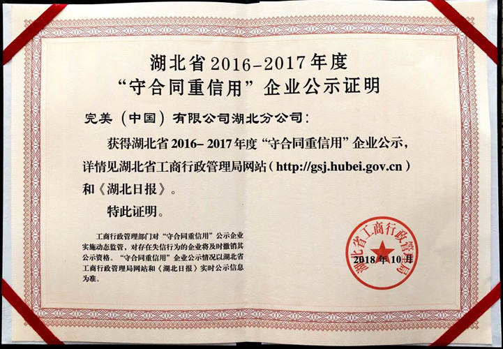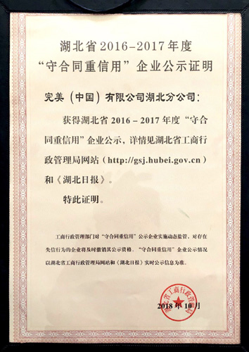 11月,完美湖北分公司荣获由湖北省工商局、省企业信用会评选的湖北省第十四届(2016-2017年度)“守合同 重信用”企业荣誉称号,这已是湖北分公司连续六届获此殊荣,树立了良好的企业形象。