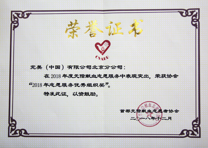 完美北京分公司荣获“2018年志愿服务优秀组织奖”