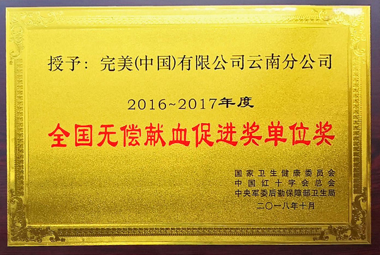完美云南分公司再获“全国无偿献血促进单位奖”