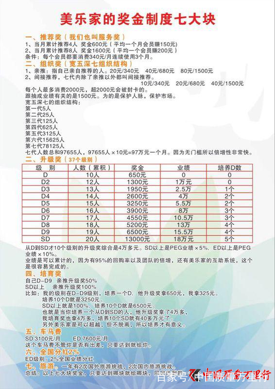 据了解,美乐家在全球通用的计酬制度——宽五深七的矩阵制。美乐家的矩阵制包括D、SD、ED、CD、PD五大阶衔,从基础阶D到高级阶PD之间又有37个阶衔。每个阶衔有相对应的直接推荐奖、组织收入奖、晋阶奖金、培育奖金、车马津贴以及分红等多种奖金。其中,直接推荐奖又包括了新推顾客卓越奖、超值套装奖金、顾客续订奖金和营销员工提成四种。推荐人数越多,所得的奖金比例也就越高。