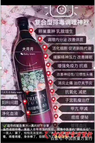 田女士告诉记者,最近美乐家的经销商在力推一款复合型果汁,记者发现美乐家的经销商在互联网平台宣传神奇的诺丽果不仅可以有效预防重大疾病,尤其是癌的发生,并对几十种疾病具有治疗效果。