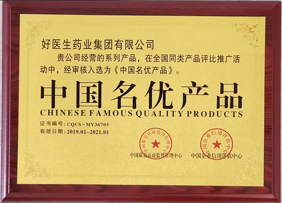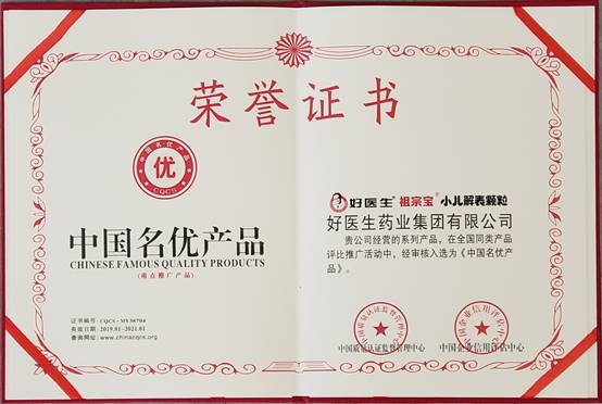 2019年1月,由中国质量认证监督管理中心(CQCS)主办的 “中国名优产品”评选结果正式公布,好医生祖宗宝小儿解表颗粒获评“中国名优产品”称号,展示了企业卓越的品质和出众的用户口碑。