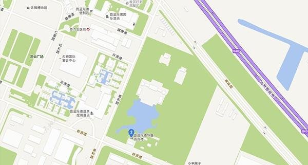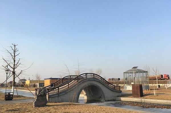 在华堂北侧,澎湃新闻记者发现,由于2015年修建的泉丰路下穿京津塘高速通道,高新路的东侧入口已被隔断,使得其成为一条被隔离的荒置道路。跨越障碍物进入高新路后看到,以华堂东侧荒地与中轮的接壤处为界,处于华堂一侧的西半段车道被改建为人工河,伴有小亭、景观桥等园林建筑,与华堂内部风格相似。处于东侧的高新路段则保持荒废原貌。在高新路以北,与之平行的是京津塘高速公路,二者中间以围墙分隔。围墙上,西侧出现了天狮的标志。一位附近企业的员工告诉澎湃新闻记者,越过交界线的路段就是“天狮的地盘”了。