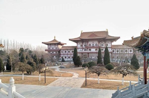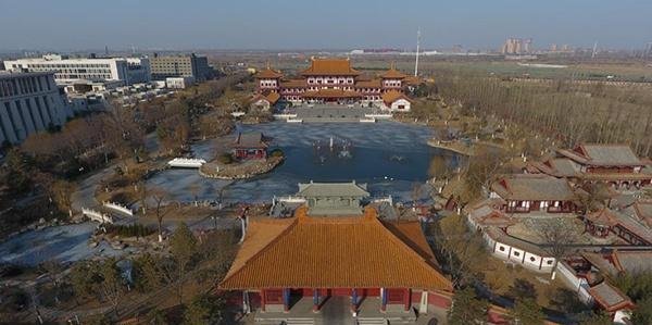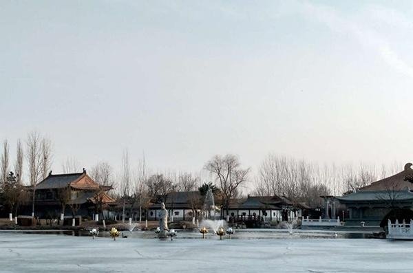 记者进入华堂后发现,华堂的整体形状呈长方形。其内部中央位置是一座结冰的人工湖,湖中建有湖心岛、观景亭、莲花状喷泉及观音塑像。在园区中轴线上与入口隔湖相望的,是一栋3至4层高、坐北朝南的仿古建筑。此外在园区北部还分布着三栋较小的殿宇。