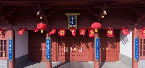 2月20日,澎湃新闻记者来到位于天津市武清区的华堂。冬末时节,华堂周边人烟稀少。整个园区由3米左右高的红色墙壁环绕,仅在南侧、西侧设有两道入口。记者到访时,南侧的主门正紧闭着。门口柱子上有“万里笙歌庆太平”“福苑宜居咲满堂”等四句题诗,写有“华堂”二字的牌匾高悬正中,落款显示其由一位何姓人士题于“壬辰金秋”(即2012年秋季)。