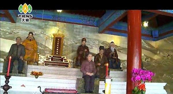 上述宣传资料称,华堂中的崇孝堂正殿内供奉着李氏光祖的雕像,每尊雕像均由整颗金丝楠木雕成。在视频网站优酷上,一则21分钟长,名为《天狮产业园2013年》的视频展现华堂内部疑似建有一座“祠堂”。视频显示,处于华堂西北角的崇孝堂门口竖立着题有“盛于李唐”四字的牌坊,大门处悬挂着“光祖门”牌匾,内部供奉着“李氏历代列祖列宗”牌位与若干座雕像。对此,张强向澎湃新闻记者确认称,李金元确实在华堂中设立了家族祠堂。从视频内容来看,牌位左侧雕像形象与《唐太宗画像立轴》中的李世民形象相似。