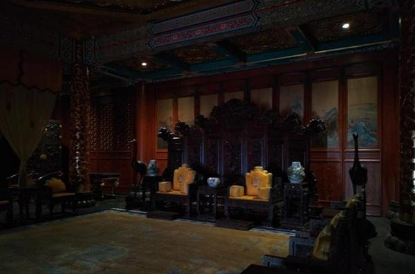 进入主楼后发现,一楼核心位置是一间会客厅,内部家具皆为中式风格,墙壁四周饰有绘画及雕花。正中位置的两张主座配以鹅黄色坐垫,面朝南方,两侧坐席依次排开。