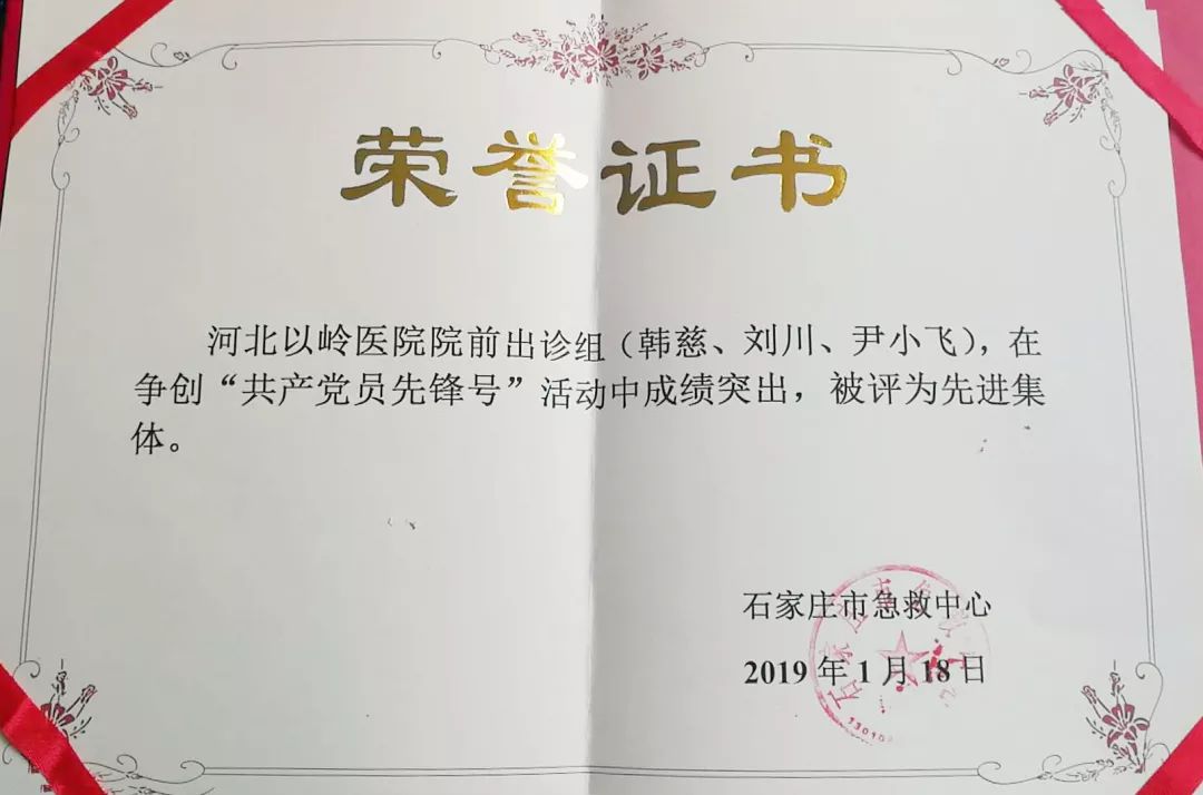 近日,以岭医院急诊科院前出诊组在争创“共产党员先锋号”活动中成绩突出,被石家庄市急救中心党总支评为先进集体。