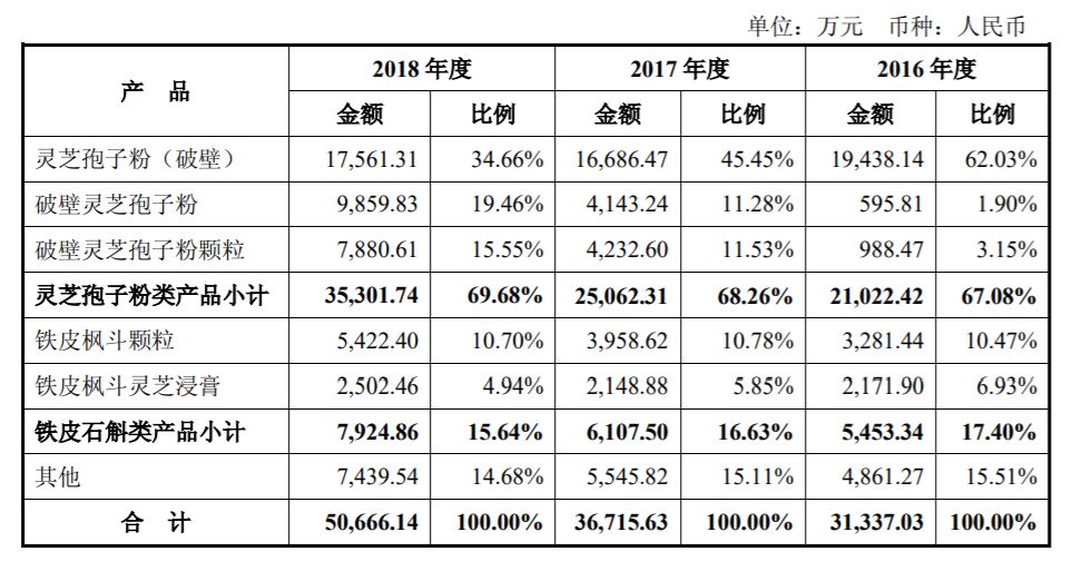 然而从历史数据看,2016年“中药饮片”灵芝孢子粉(破壁)年销售额为1.94亿元,占比62.03%,至2018年,“中药饮片”灵芝孢子粉(破壁)年销售额降至1.75亿元,占比降至34.66%;而“保健品”破壁灵芝孢子粉及破壁灵芝孢子粉颗粒则从2016年的年销售额合计1500万元左右,剧增至2018年的1.77亿元,占比也从微不足道的5%左右,增至35%,加上铁皮枫斗的份额,保健品的年销售额在全公司的占比已达到三分之二。