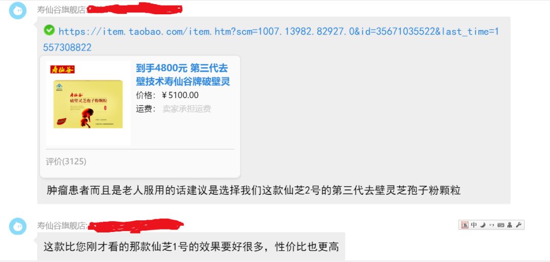 在一位消费者提供给中国网财经记者的聊天截屏中也可以看到,寿仙谷官方淘宝店的客服,在消费者咨询售价1450元的“中药饮片”仙芝1号的药效时,反而向其推荐起售价5100元的保健品“去壁灵芝孢子粉颗粒”,同时还声称保健品比“中药饮片”的“效果要好很多,性价比也更高”。