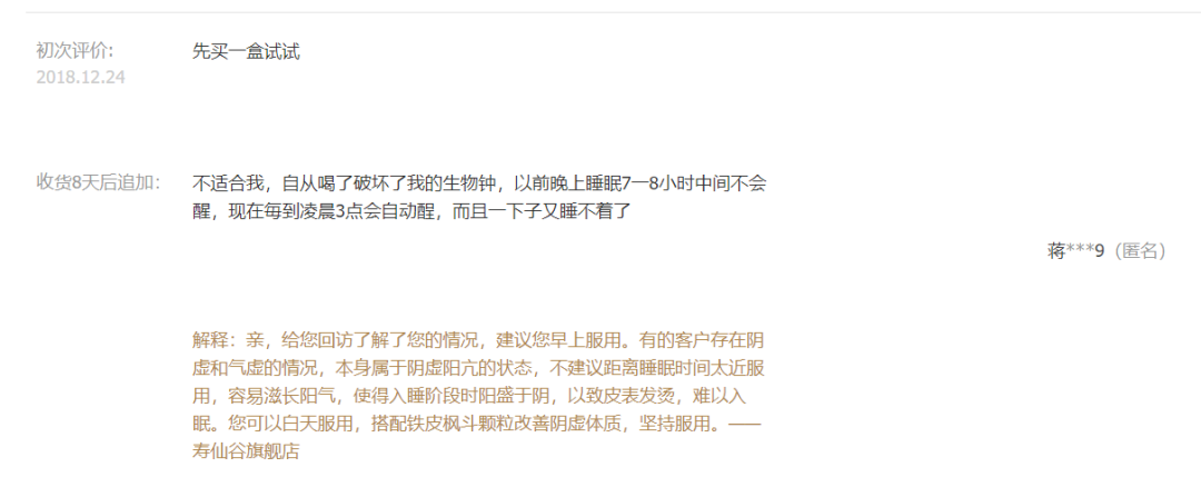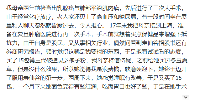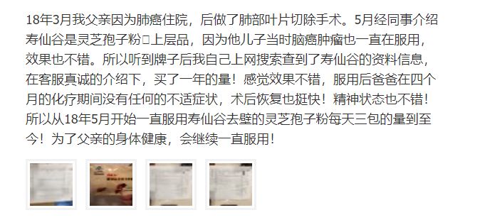 然而正是由于有大量此类“擦边球”宣传抗癌防癌功效的广告软文存在,尽管寿仙谷的中药饮片及保健食品的“功能与主治/保健功能”中,并无半点与癌症相关的内容存在,寿仙谷官方淘宝店中还是出现了大量慕名而来的肿瘤患者及其亲属。