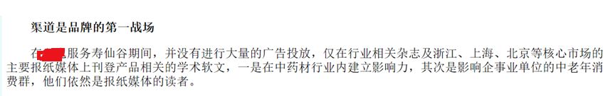 在一篇曾服务于寿仙谷的营销机构发布的文章中,我们也可以管窥寿仙谷“直击目标群体”的营销策略——以“学术软文”包装高科技形象、盯准“爸妈们的口袋”:“服务寿仙谷期间,(我们)并没有进行大量的广告投放,仅在行业相关杂志及浙江、上海、北京等核心市场的主要报纸媒体上刊登产品相关的学术软文,一是在中药材行业内建立影响力,其次是影响企事业单位的中老年消费群,他们依然是报纸媒体的读者。”
