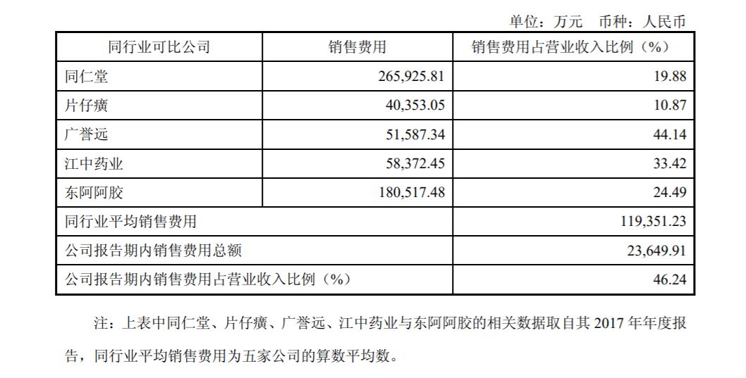 而当记者看到寿仙谷在产品“抗癌方向”的研发费用投入,也感到啼笑皆非:五项针对多种恶性肿瘤的研究,整个2018年,只有几十万、一两百万的投入。 与研发费用形成鲜明对比的是销售费用,2018年寿仙谷销售费用高达2.3亿元,而全年总营收不过5亿元,销售费用占营收比高达46%,远远超过同仁堂、片仔癀(106.370, -2.12, -1.95%)等中医药企业。