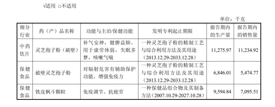 公司年报显示,公司产品“中药饮片”主要为灵芝孢子粉(破壁)一种,年销量1.1万公斤,“蓝帽子”保健食品两种,分别为破壁灵芝孢子粉和铁皮枫斗颗粒,年销量总计1.2万公斤以上。表面上看起来,中药饮片产品与保健品仍旗鼓相当,可谓双轮驱动。