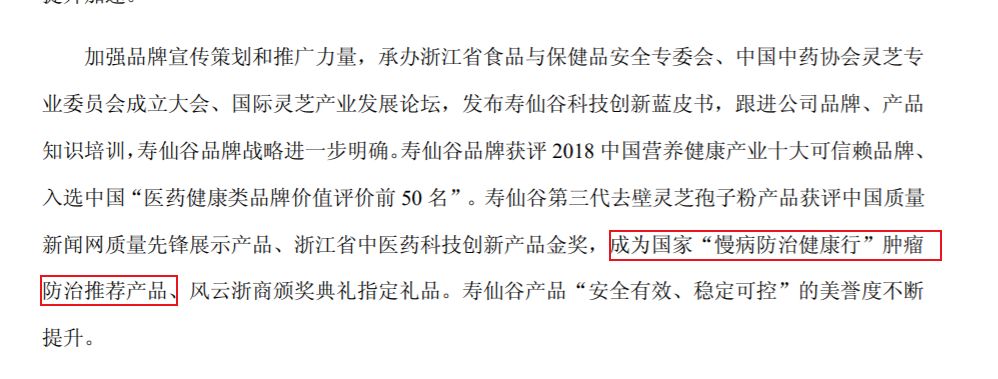 实际上,据寿仙谷2018年年报显示,公司主营产品中药饮片和保健食品均有明确的“功能与主治/保健功能”的说明,其中中药饮片灵芝孢子粉(破壁),其功能与主治为“补气安神、健脾益肺,用于虚劳体弱,失眠多梦,咳嗽气喘”,而保健食品破壁灵芝孢子粉的保健功能则标注为“对辐射危害有辅助保护功能,增加免疫力”。