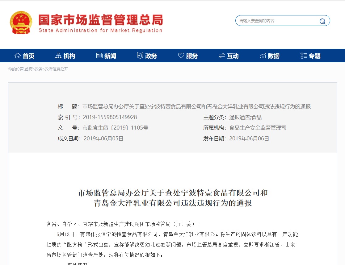 6月6日 ,市场监督管理总局发布《市场监管总局办公厅关于查处宁波特壹食品有限公司和青岛金大洋乳业有限公司违法违规行为的通报》就媒体报道宁波特壹食品有限公司、青岛金大洋乳业有限公司将生产的固体饮料以具有一定功能性质的“配方粉”形式出售,宣称能解决婴幼儿过敏等问题的相关情况进行了通报。