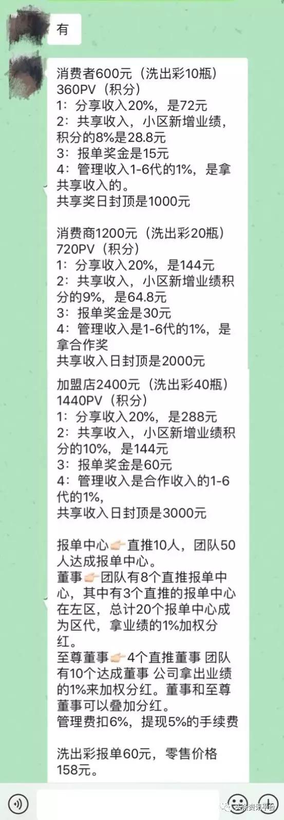 下面,我们再来看看爱暄堂洗出彩的奖金制度。爱暄堂洗出彩根据投资拿货的数量来划分等级,将代理分为三个级别:消费者、消费商、加盟商。产品的统一零售价为158元,报单价则统一为60元。(在生产厂家汉柔公司的淘宝网店上,我们发现其“洗出彩”系列产品的零售价都同样为158元。)