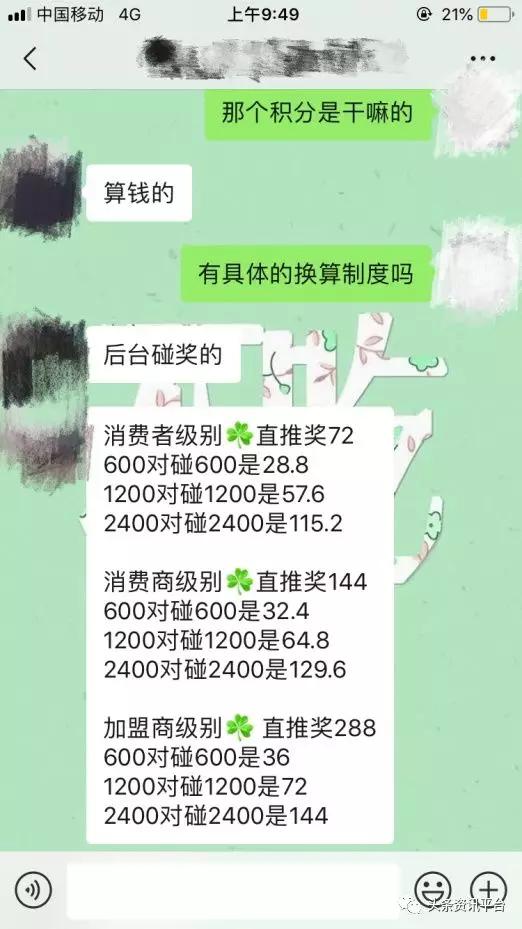 从上图中可以看出,代理级别越高,拿到的奖金分红也就越多。从经销商小吴的介绍来看,爱暄堂洗出彩的奖金种类很多,并且有分享奖、共享奖等,代理获得的积分将采取后台对碰双轨制政策。