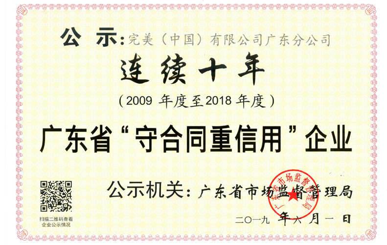 近日,完美广东分公司获得由广东省市场监督管理局评定“广东省守合同重信用企业”荣誉称号。凭借良好的企业信用,广东分公司已连续十年(2009-2018)获得此项殊荣。