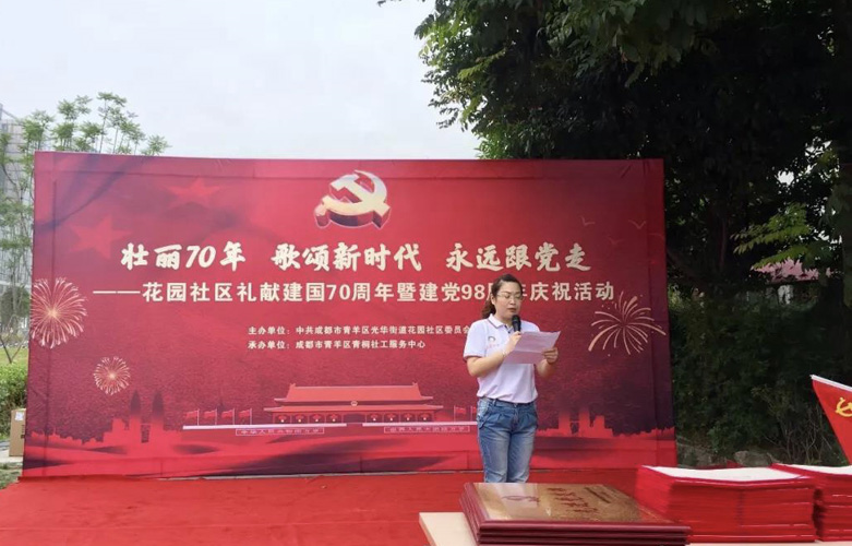 壮丽70年,奋斗新时代,永远跟党走。6月28日,成都市青羊区光华街道花园社区礼献建国70周年暨建党98周年庆祝活动,在社区广场顺利举行。完美四川分公司党支部,资阳商会党支部,宏远与银鑫两家企业的党支部,上城与水木光华院落党支部等,齐聚一堂,共同庆祝党的生日。
