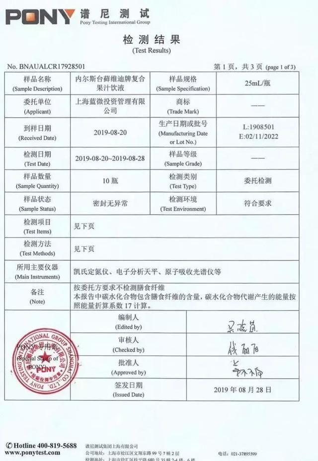 李女士无奈自掏腰包在网上找到上海微谱化工技术服务有限公司花2120元进行了检测,检出成分竟然是浓度高达58%的异丙醇和4.6%的2-丁酮,其他成分为水,没有该产品营养成分表和配料里宣称的任何成分。