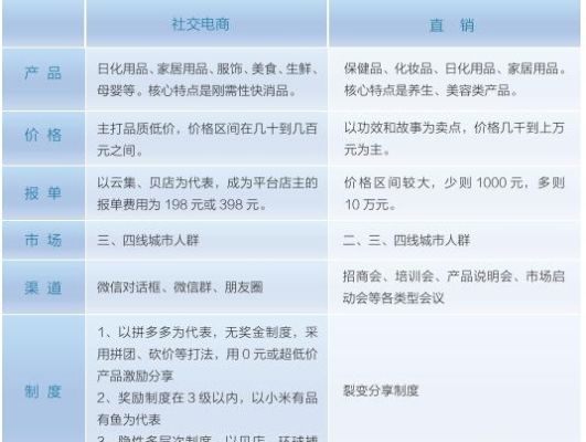 社交电商与直销在产品、价格、报单、市场、渠道、制度的差异见下页图表