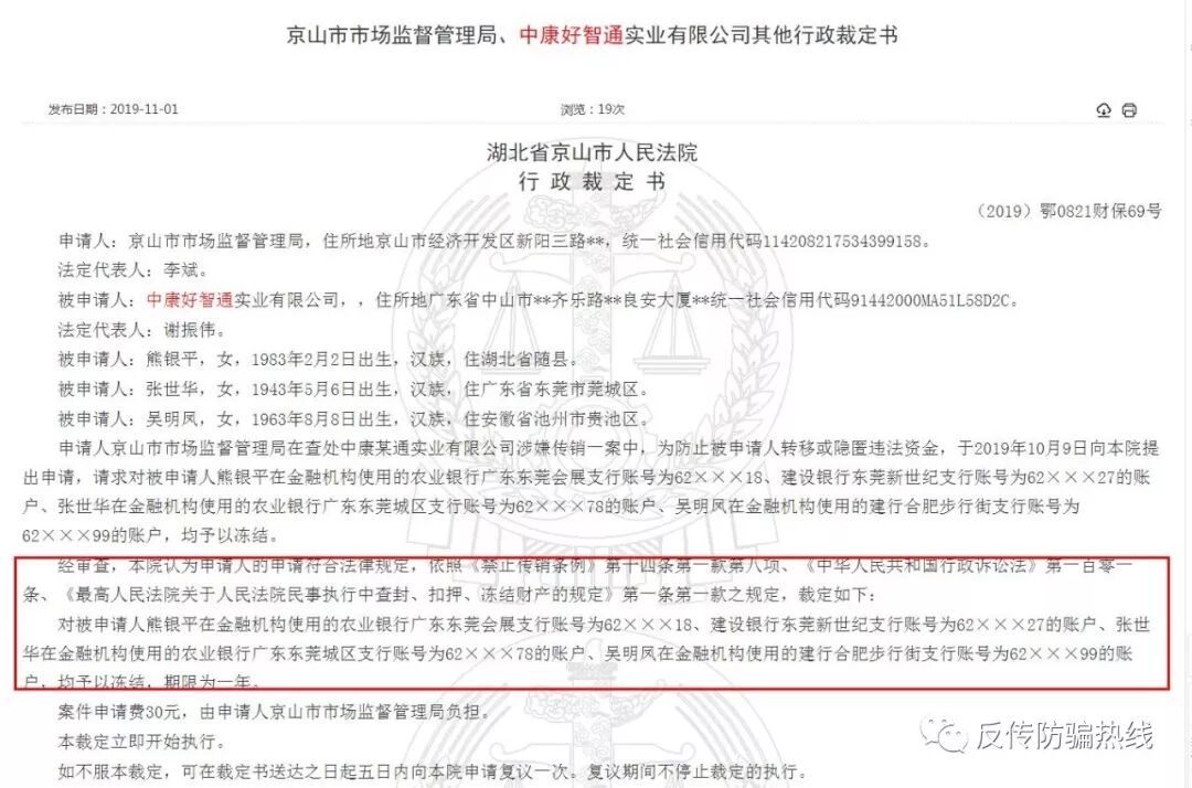 2019年10月初,中国裁判文书网上发布了一则裁定书,裁定显示7月30日,京山市市场监督管理局(以下简称:京山市市监局)在查处中康好智通涉嫌传销一案中,为防止中康好智通、深圳市好智通实业有限公司(以下简称:深圳好智通)、江苏好智通医疗设备有限公司、谢某伟、张某、王某、黄某、莫某辉、张某举、张某甲、樊某然、王某传、赵某、简某霞、翁某泳、曾彩英转移或隐匿违法资金,向京山市法院提出申请,请求对上述被申请人在金融机构使用的24个银行账户和在保险公司投保的6个保单予以冻结。京山市法院审查,认为京山市市监局的申请符合法律规定,依照禁止传销条例等相关法律的规定,裁定对上述被申请人在金融机构使用的银行账户和在保险公司投保的保单均予以冻结,期限为一年。