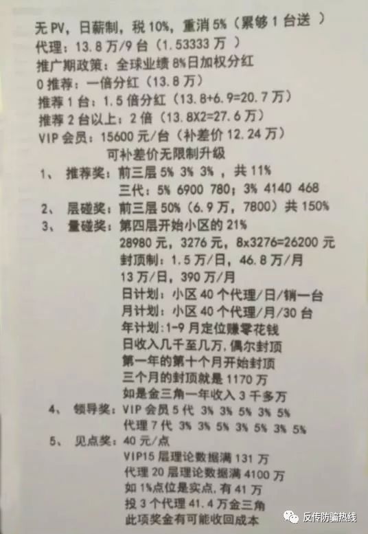 根据受害者发来的资料,广东望重健康科技有限公司分为三级代理,即取代:即区代:13.8万,二次拿货价6折;市代:58万,二次进货价5.5折;省代:168万,二次进货价5折。利润计算:以区代二次进货价6折,15600*0.6=9360元,15600-9360=6240元,假设每个月销售10台仪器6240*10=62400元;成为区代二次进货价每台仪器区域补帖10%,9360*10%=936(不入网体)。