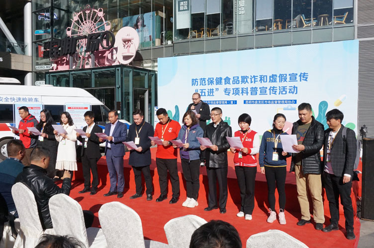 为履行企业社会责任,与政府共建诚信经营、理性消费的市场秩序,12月23日,云南分公司配合昆明市和盘龙区市场监督管理局在昆明同德广场开展防范保健食品欺诈和虚假宣传“五进”专项科普宣传活动。云南分公司公共事务部经理崔绍君代表分公司,与其他12家企业代表一起宣读了《企业诚信生产经营承诺书》。