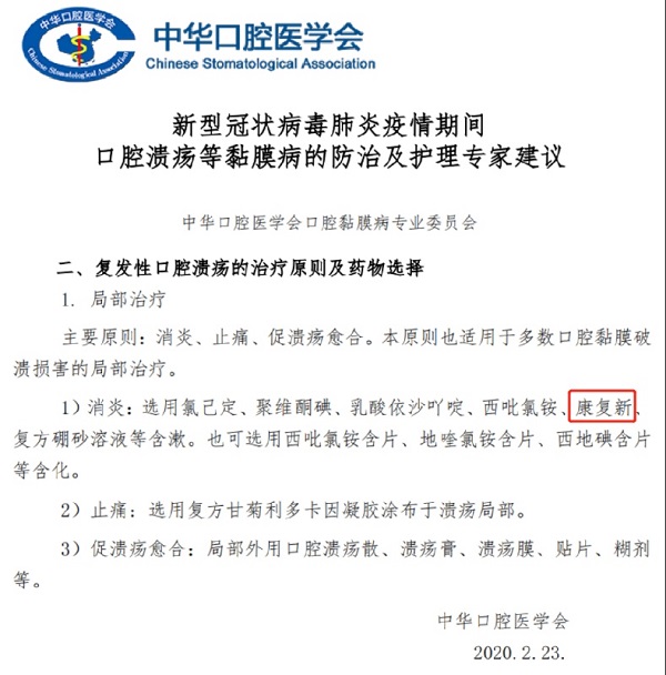 疫情就是命令,为了支持此次武汉抗疫,国家调派3万多名医护人员支援武汉。广大医务人员投入紧张的医疗救治工作,因为精神高度紧张,工作强度大,进隔离病区后数小时不能喝水,饮食不规律,睡眠不足等因素,容易发生口腔黏膜溃疡等口腔黏膜疾病。为此,中华口腔医学会起草了《新型冠状病毒肺炎疫情期间口腔溃疡黏膜病的防治及护理专家建议》,并号召医药企业向抗疫前线捐赠适用药品。好医生康复新液溶液剂主动修复黏膜创面,消除炎症水肿,缩短创面愈合时间,用于口腔溃疡及口腔黏膜疾病的防治,疗效确切。