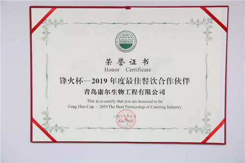 2019年6月,康尔生物在第四届世界厨师艺术节的高度参与得到世界中餐业联合会的完全认可,荣膺“烽火杯——2019最佳餐饮合作伙伴”大奖!