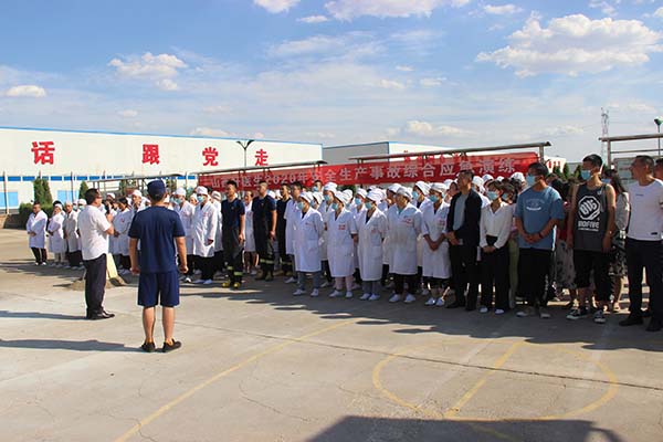 15:30,演练正式开始:火灾警报在紧张生产的车间突然响起,通讯组通过消防广播系统发出警报,并拨打了火警电话,抢险组、疏散组、救护组、后勤组接到指令后各司其位,根据预案穿戴好装备、带上应急设备,迅速进入状态各司其职,应急疏散组组长在各安全口为员工紧急疏散指明方向,一个断后确保车间人员全部撤离火灾现场。大家在演练过程中用袖口捂住口鼻然后弯腰在3分钟内快速有序地都跑到了厂区应急避难场所篮球场,后勤保障组随后在集合点清点各部门人员是否全部安全撤离时发现,有一名员工在逃生中被困,救护组立即启动前往事故现场实施营救,最终公司人员全部安全撤离。