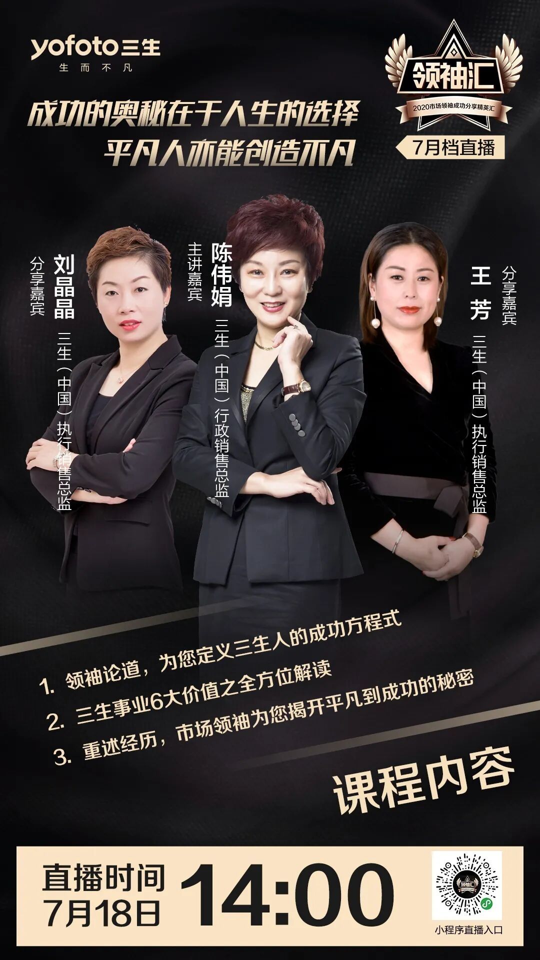 7月18日 ,【领袖汇】直播栏目第5期励志来袭,三位优秀的三生领袖重述经历,为您揭开平凡到成功的秘密。