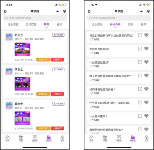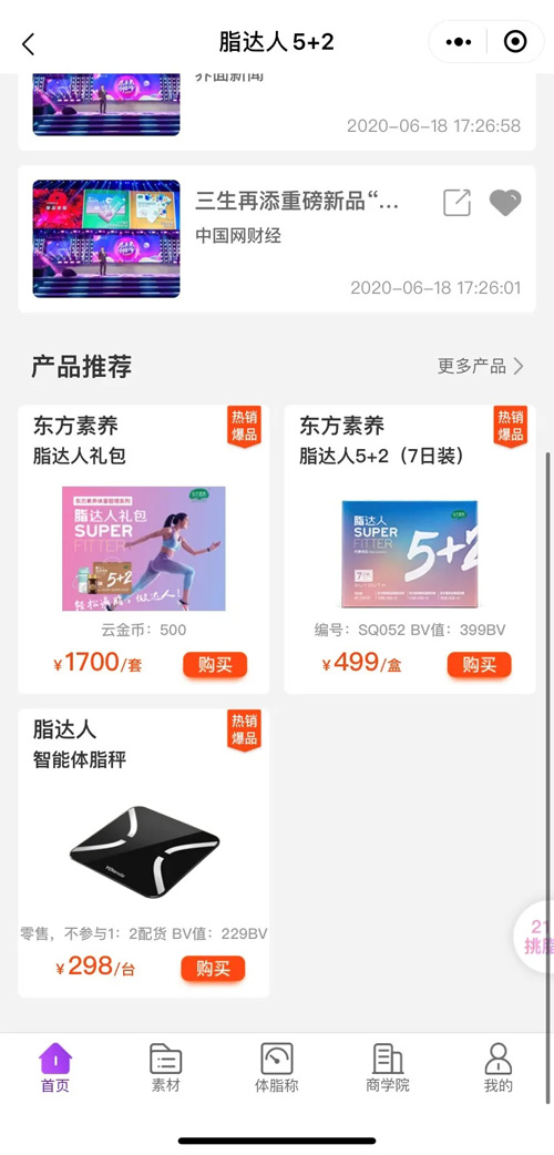 “三生脂达人”小程序是三生针对爆品“脂达人5+2”产品特别打造的首款单品小程序,为伙伴们提供全面的减脂生活指导及展业服务,是一款实用、便捷、强大的产品推广工具。