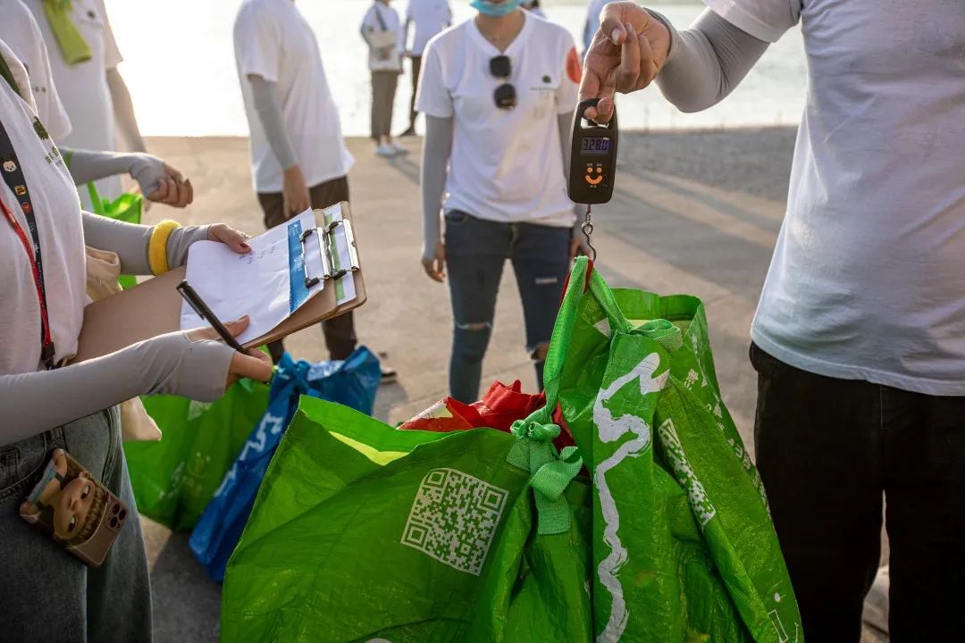 志愿者们认真地进行垃圾的捡拾、记录、分类和称重