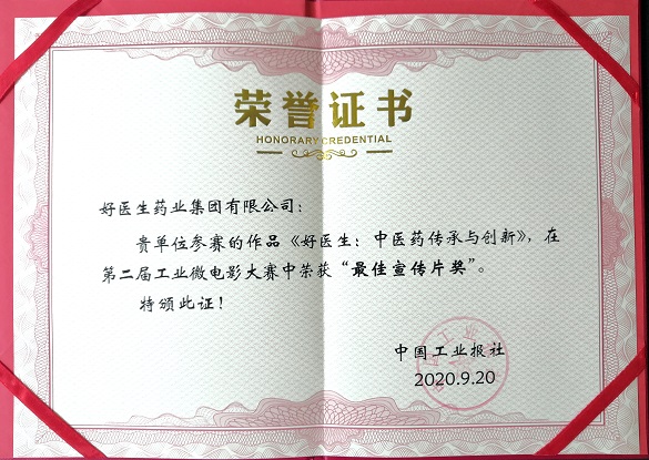 近日,由中国工业经济联合会指导,中国工业报社、中国教育电视台主办的“2020中国首届工业影视创新发展大会暨第二届中国工业微电影大赛颁奖典礼”在山东泰安市召开。大会现场公布了备受瞩目的第二届中国工业微电影大赛获奖作品名单,好医生集团企业文化宣传片《好医生:中医药传承与创新》在第二届工业微电影大赛中首次荣获“最佳宣传片奖”。