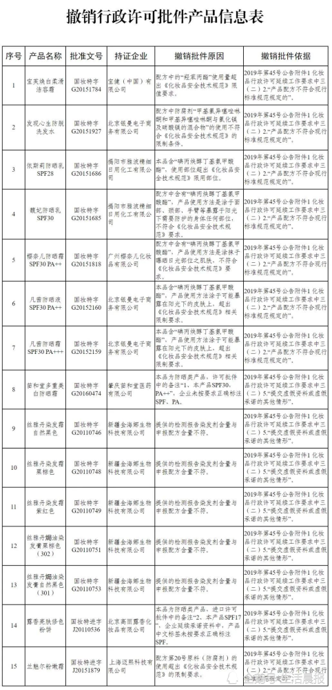 日前,国家药品监督管理局官网发布《国家药监局关于撤销部分承诺制延续特殊用途化妆品行政许可批件的公告》(以下简称《公告》)。 《公告》称,依据相关规定,国家药监局组织开展特殊用途化妆品行政许可批件延续申报资料技术审查,发现包括洁容霜、防晒乳、染发霜等在内的15个特殊用途化妆品,存在不符合产品安全性相关规定要求等违法违规情形,现依法予以撤销批准文号。