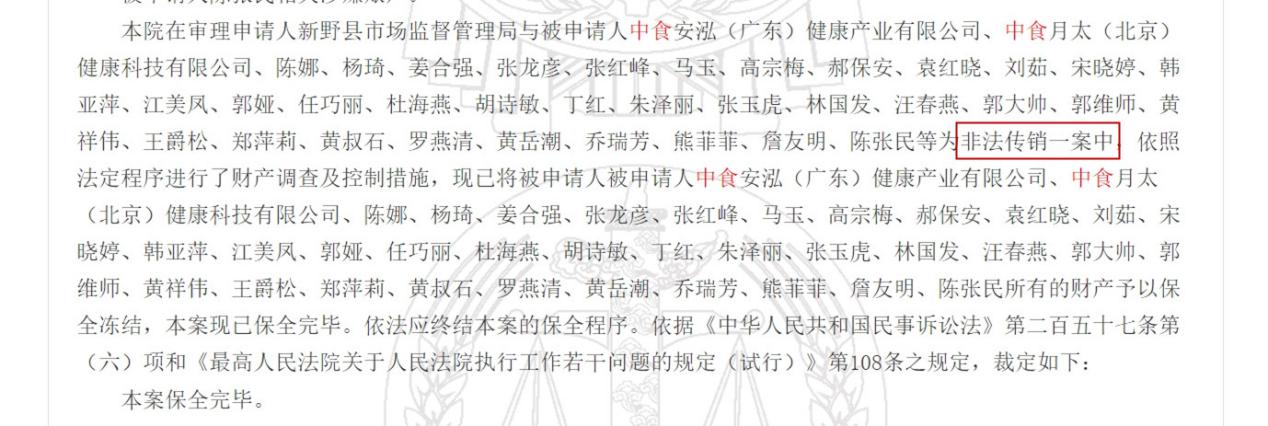 近日,中国裁判文书网发布《新野县市场监督管理局、中食安泓(广东)健康产业有限公司执行实施类执行裁定书》(以下简称:《执行裁定书》)。该《执行裁定书》显示,河南新野人民法院在审理新野县市场监督管理局与被申请人中食安泓(广东)健康产业有限公司(以下简称:中食安泓)、中食月太(北京)健康科技有限公司(以下简称:中食月太)、陈娜、杨琦等人非法传销一案中,依照法定程序将36个被申请人的财产予以保全冻结。