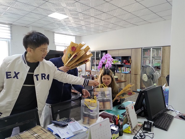 3月8日上午,集团总部晨会结束后,公司工会主席胡升平、妇女主任彭红为公司总部全体女职工送上节日祝福以及公司精心准备的节日礼品和玫瑰花。女性职工欣喜地接到从领导手中递来的礼物,连连表示感谢。上午11点,总部女员工的礼品已经全部发到了她们的手中。随后,公司工会领导驱车前往天府生命科技园、大丰中药研发、京鸿阁国医连锁、西区库房等地给“散落”在各个地方的好医生女职工送节日祝福。
