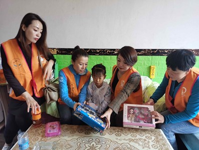 (如新公益基金会志愿者为资助患儿带去礼物)